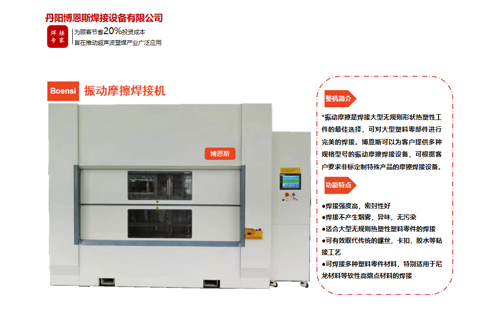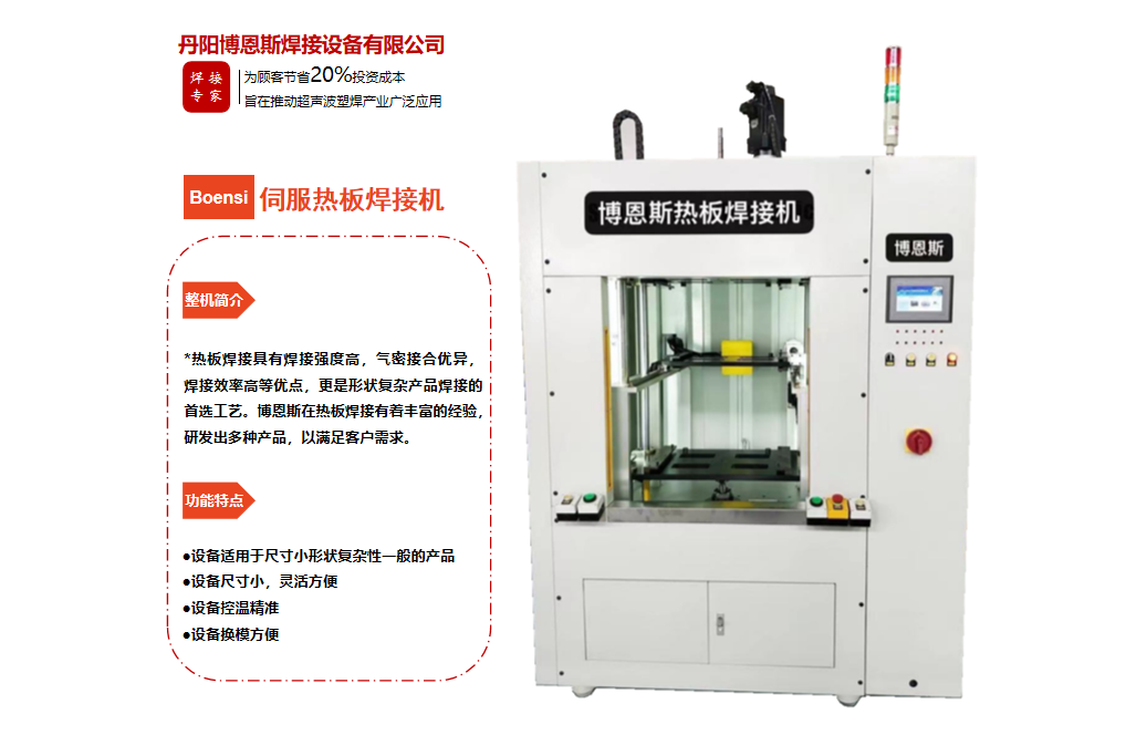 丹陽博恩斯焊接設(shè)備有限公司是塑料焊接領(lǐng)域集研發(fā)設(shè)計(jì)、生產(chǎn)制造、銷售服務(wù)為一體的企業(yè)。公司自成立以來堅(jiān)持“以人為本”的理念,組織了一支強(qiáng)大的技術(shù)研發(fā)團(tuán)隊(duì),攜多年來積累的豐富經(jīng)驗(yàn),并結(jié)合國際先進(jìn)塑料焊接技術(shù),根據(jù)市場需要,不斷開發(fā)具有核心競爭力的新產(chǎn)品。公司具有很強(qiáng)的非標(biāo)機(jī)械研發(fā)、設(shè)計(jì)、生產(chǎn)能力,可為廣大客戶定制各類專用機(jī)械設(shè)備。公司設(shè)計(jì)生產(chǎn)的塑料焊接設(shè)備已廣泛應(yīng)用于汽車、電子、家電、醫(yī)療器械、無紡布...